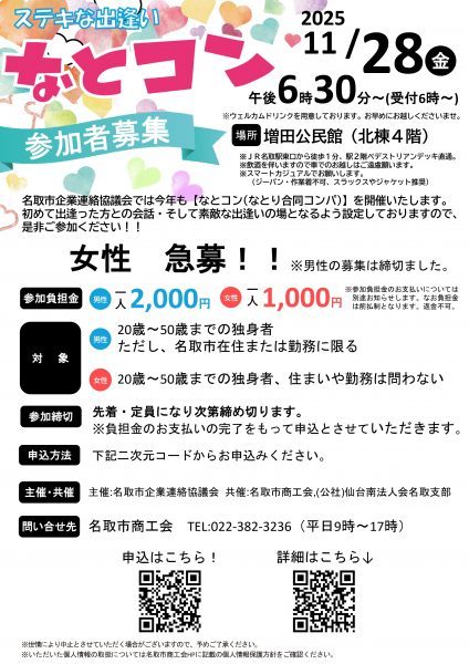 名取市企業連絡協議会では今年も「なとコン」を開催いたします。素敵な出逢いの場となるよう設定しておりますので、皆様のご参加お待ちしております。